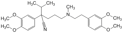 Verapamil is a phenylalkylamine calcium channel blocking agent. Verapamil inhibits the transmembrane influx of extracellular calcium ions into myocardial and vascular smooth muscle cells, causing dilatation of the main coronary and systemic arteries and decreasing myocardial contractility. Chemical name of verapamil is 2-(3,4-dimethoxyphenyl)-5-[2-(3,4-dimethoxyphenyl)ethyl-methyl-amino]-2-propan-2-ylpentanenitrile (fig. 3) [3].