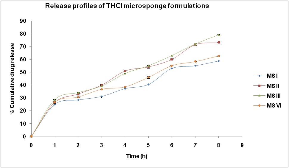 The THCI release from the microsponge formulations is shown in fig. 5 and table 4. The fig. shows that, generally, the release rate was high during the first two hours then the microsponges were able to sustain the release of THCI for more than 8 h in most formulations was shown in table 4. THCI release kinetics of microsponges on the basis of the highest r2 can be explained by Higuchi diffusion mode (data not shown). Based on the above characterization MS IV (having acceptable yield, particle size, high entrapment efficiency, and slow-release profile) was chosen as candidate formula and was subjected further in gel formulations.