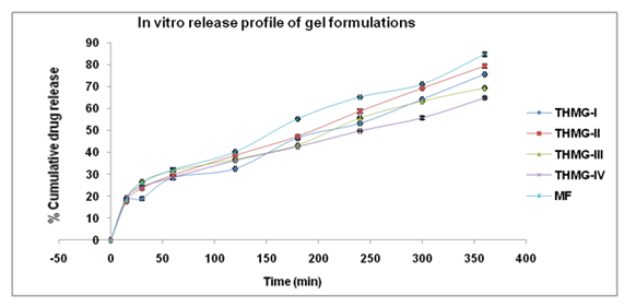 The in vitro release profile of four THCI microsponges gels was observed for 6 h and was depicted in fig. 6 and table 6. The total amount of drug release was 75.63%, 79.4%, 69.4%, 64.9% and 84.8% observed at different time intervals for a period of 6 h for THMG I-IV and Marketed formulation (MF) respectively. The gel formulation (THMG II) showed the best release i.e. total amount of drug release was 79.4 %. From the logarithmic plot of the release data log Q versus log t of TMHG II, the diffusion exponent (n) and the kinetic constant (k) have been calculated, as shown in table 5. The results showed that n value of microsponges loaded gel is less than 0.5. This indicates that the mechanism of drug release is Fickian diffusion, and is controlled by the porosity of the microsponges.