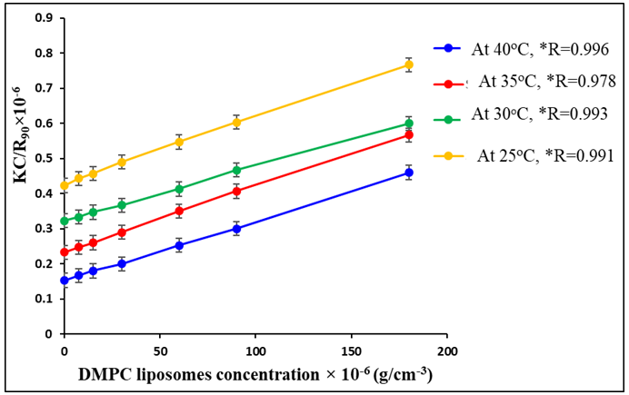 Fig. 1: Determination of the weight average small unilamellar DMPC liposomes weight (Lw) at λ 546 and at different temperatures (the reciprocal of the intercept was taken as Lw after correction for the Cabannes' factor). *R=the regression line correlation coefficient. The values obtained were the mean of three experiments (n= 3). The standard deviations are shown as error bars and all values were in the range of+0.01-0.03