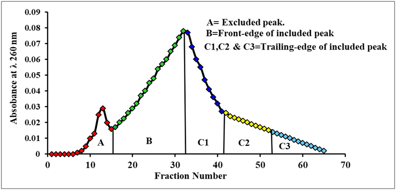 Gel fractionation elution profile of the sonicated DMPC liposomes exhibited an excluded peak (A), a front edge of the included peak (B) as well as the trailing edge of the included peak (C1, C2, and C3) (fig. 2).