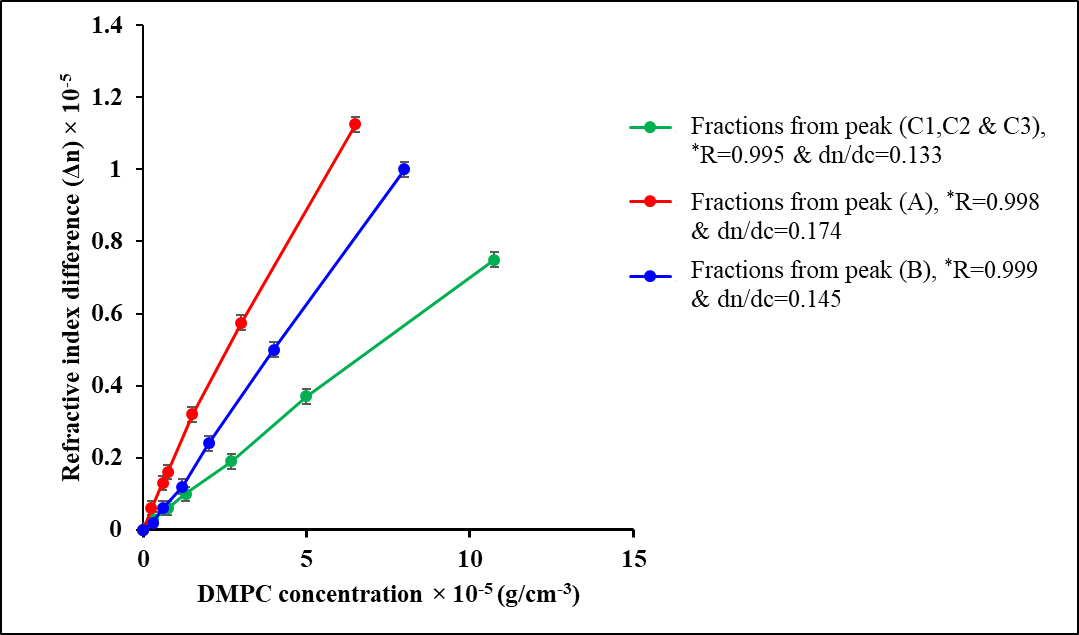 Fig. 3: Determination of the refractive index increment (dn/dc) of different fractions of sonicated DMPC liposomes from peak (A), peak (B) and peak (C1, C2 andC3). *R=the regression line correlation coefficient. The values obtained were the mean of three experiments (n= 3). The standard deviations are shown as error bars and all values were in the range of+0.02-0.04