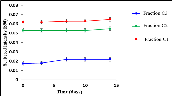 Fig. 5: Changes in the scattered intensity (S90) of different fractions of small unilamellar DMPC liposomes from the trailing edge of the included peak (C1, C2 and C3) against time at 25 °C. The values obtained were the mean of three experiments (n= 3). The standard deviations are shown as error bars and all values were in the range of+0.005-0.02