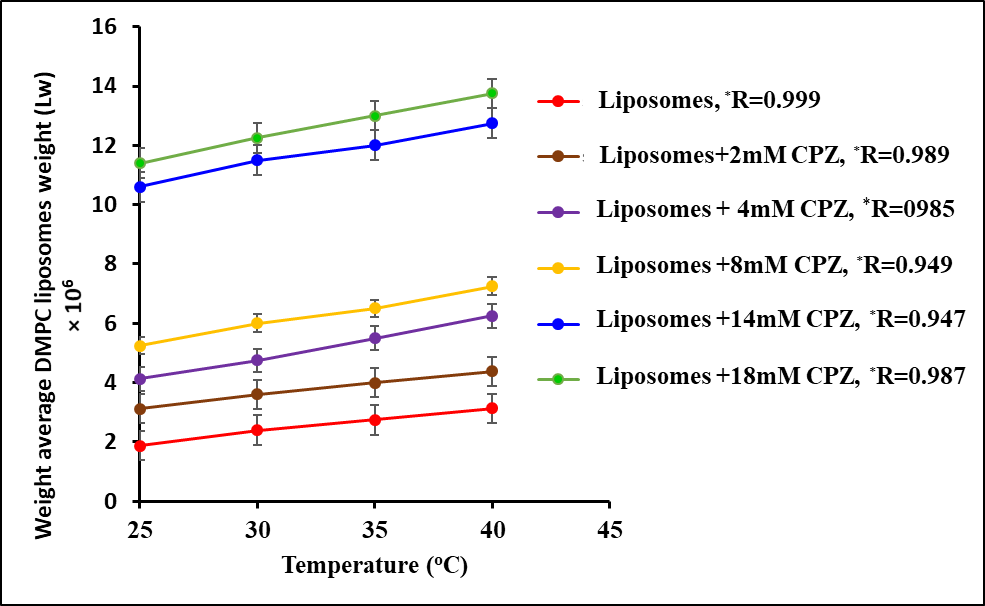 Fig. 6: Temperature-dependent weight average DMPC liposomes weight (Lw) with different CPZ concentration below and above the CMC.*R=the regression line correlation coefficient. The values obtained were the mean of three experiments (n= 3). The standard deviations are shown as error bars and all values were in the range of+0.02-0.05