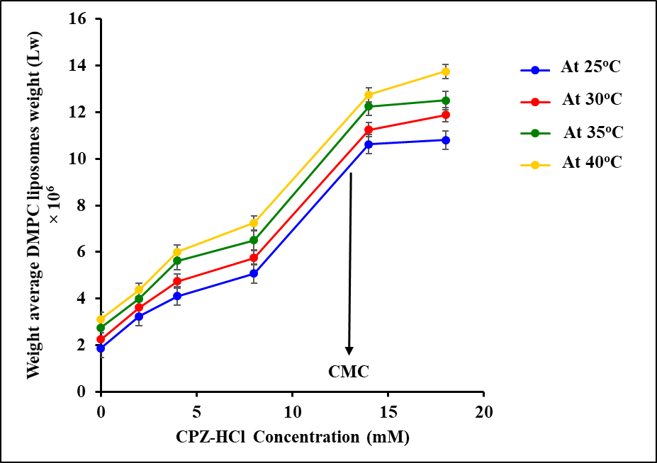 Fig. 7: Weight average DMPC liposomes weight as a function of CPZ-HCl concentration at different temperatures. The values obtained were the mean of three experiments (n= 3). The standard deviations are shown as error bars and all values were in the range of+0.02-0.05