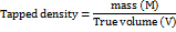 Tapped density was determined by using Electro lab density tester, which consists of a graduated cylinder mounted on a mechanical tapping device. An accurately weighed (M) sample of powder was carefully added to the cylinder with the aid of a funnel [12]. Typically, the initial volume was noted, and the sample is then tapped (100 tappings) until no further reduction in volume is noted or the percentage of difference is not more than 2%. A sufficient number of taps should be employed to assure reproducibility for the material in question. True volume (V) was noted and tapped density is calculated using following formula: