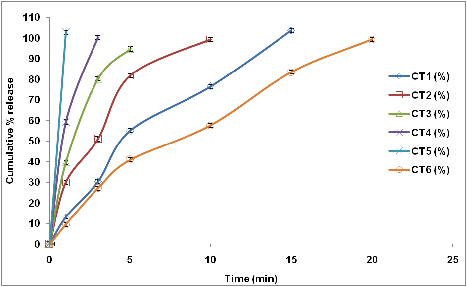 The hardness test is one of the control parameter during the manufacturing of tablets. The recommended hardness for core tablet is 2-3 kg/cm2. The hardness of core tablets from CT1-CT6 is found to be within limits. The thickness of tablets is related to tablet hardness. The thickness of all core tablets is found to be within limits. The average weight variation of tablets was found within limits of 5% (according to Indian Pharmacoepia). The average weight variation of core tablets CT1-CT6 was within 3-4% range which indicates that they are within limits. The friability value which is also affected by the hardness value of tablets should be in the range of 0.5-1% limits [17]. It was found that the friability of prepared core tablets is within standards. The assay of all core tablets was found to be within limits. The disintegration test is performed for all core tablets. From CT1-CT5 the amount of SSG is increased. The disintegration time is decreased based on amount of SSG. So, for CT5 the disintegration time is faster when compared to all other formulations i. e, CT1-CT4. In CT6 formulation SSG is not used, so, it took longer time to disintegrate when compared to all other formulations.