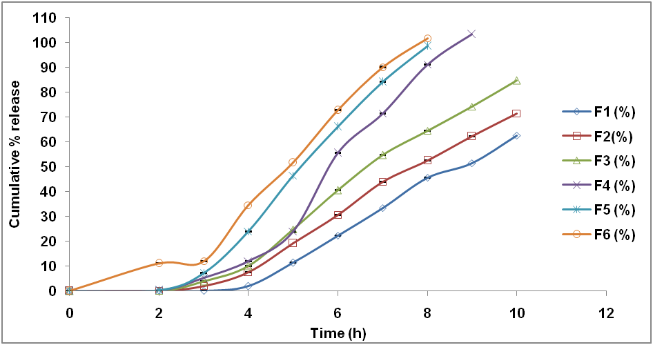 To the core tablet CT2, different polymers (ethyl cellulose, HPMC E15 and HPMC K4M) were added according to table 2 and compressed into a tablet. The prepared press coated tablets were further evaluated for hardness, thickness, friability, weight variation and assay. The recommended hardness for tablet is 4-8 kg/cm2. From formulations F1-F13 the hardness was found to be within range 4-5 kg/cm2which indicate that the hardness is within limits. The thickness of tablets is related to tablet hardness. The thickness of all tablets is found to be within limits. The average weight variation of tablets was found to be within range 2-4% which indicates that it is within limits. It was found that the friability of prepared tablets was within the range 0.6-0.8%. The assay of prepared tablets was also found within the limits with range 97-99%.