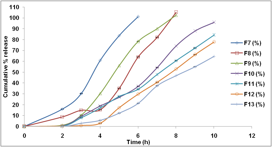 Press-coated tablets were evaluated for drug release in 0.1NHCL and 6.8 pH phosphate buffer with 0.3% SLS. From fig. 2, it is observed as ethyl cellulose is decreased gradually from F1-F6 drug release is increased and from F7-F13 (fig. 3) as ethyl cellulose is increased gradually drug release is decreased.