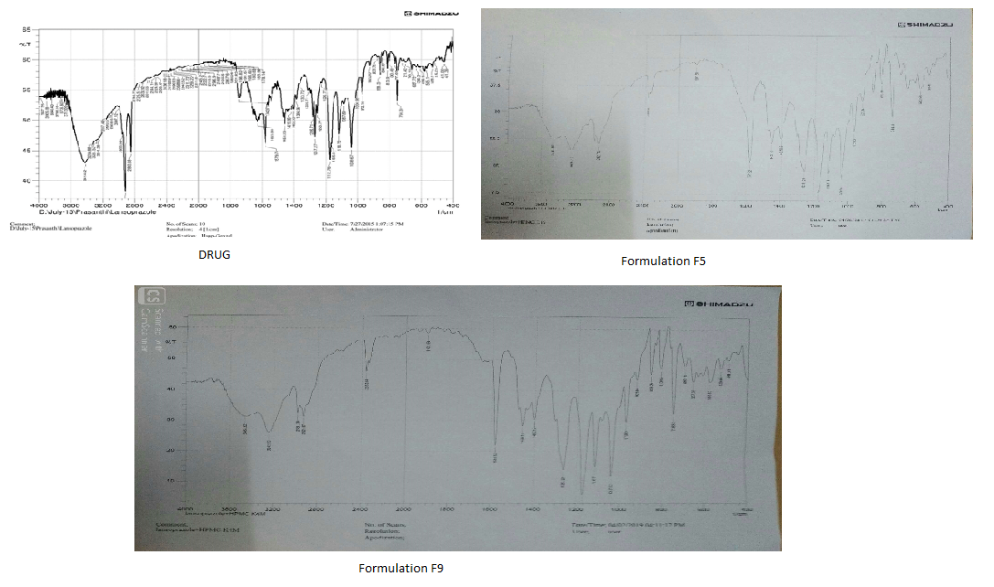 Fig. 4: FTIR peaks of drug, formulation F5 and formulation F9