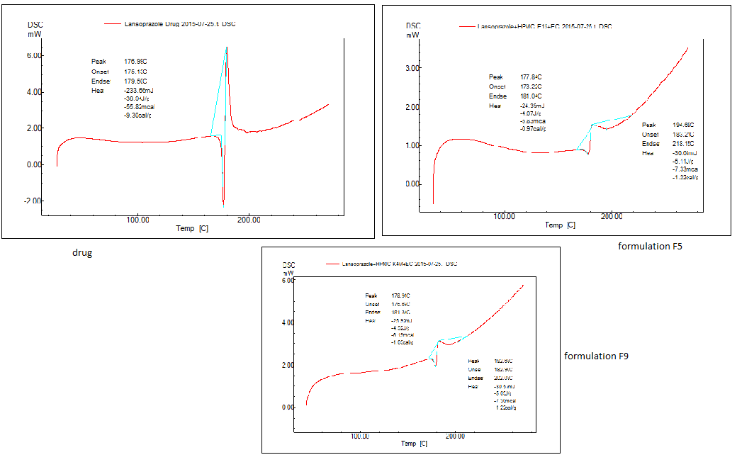 Thermal behavior of pure lansoprazole, formulation F5 and F9 physical mixture are depicted in fig. 5. The pure lansoprazole showed melting endothermic peak at 176.99 °C, in formulation F5 peak 177.84 °C and formulation F9 peak at 178.91 °C. These minor changes may not necessarily indicate potential incompatibility.