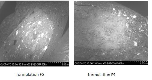 The effect of coating on the morphology of the core tablet was observed using SEM. The main objective of scanning electron microscopy is to study the different coating layers on core tablet. Obtained SEM photographs of tablets coated with ethyl cellulose and HPMC E15 i.e. F5 and tablets coated with ethyl cellulose and HPMC K4M i.e. F9 are shown in fig. 6. From this we can observe that coating is uniform for both the optimized formulations.