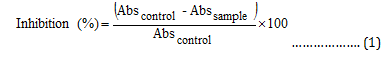 Where Abssample represents absorbance of samples being tested and Abscontrol represents that of 0.2 M potassium phosphate buffer (pH 6.8).