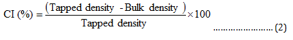 CI was calculated using tapped and bulk densities. A weighed quantity of the prepared powder admixture was carefully poured into 100 ml graduated cylinders. The volume occupied by the powder was read, and the bulk density was calculated in g/ml. The tapped density was calculated using tapped volume which was obtained after sufficient taps. CI of each powder mix was calculated using equation (2) [16].