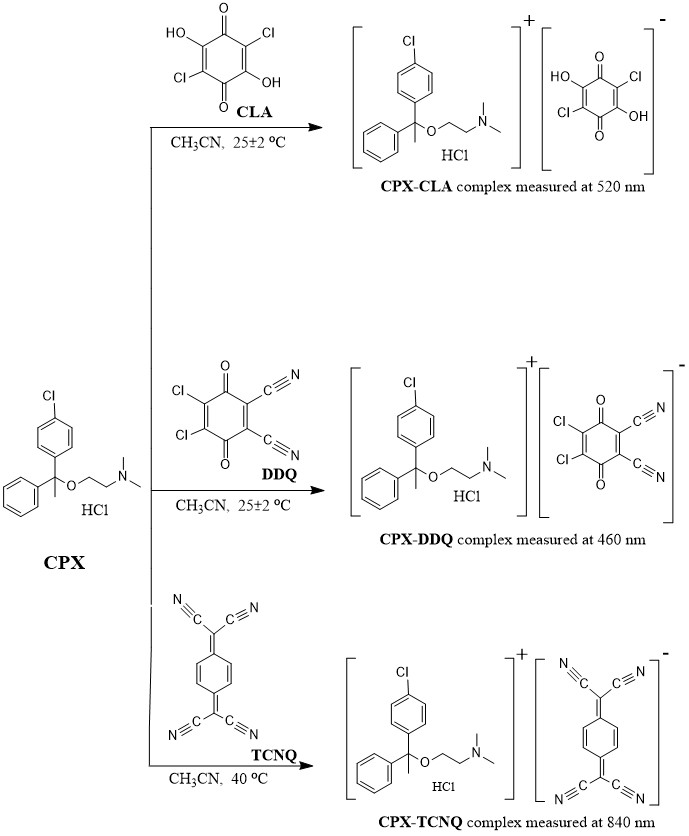 Chlorphenoxamine hydrochloride (CPX) yielded intense colors with CLA, DDQ, and TCNQ in acetonitrile, absorbing maximally at wavelengths, 520, 460 and 840 nm, respectively, and this was due to the reaction between CPX acting as n-donor (D) and CLA, DDQ, and TCNQ as π-acceptors [23] which lead to the formation of charge transfer complexes which showed in fig. 2.