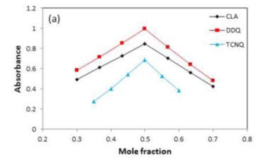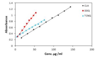Results: The complexes obeyed Beer’s law in the concentration range of 16-144, 6-54 and 4-76 μg/mlwith molar absorptivity at 0.30×104, 0.68×104 and 0.58×104 l/mol/cm for CLA, DDQ, and TCNQ, individually. According to Benesi-Hildebrand plots, the association constants and changes of standard free energy were determined. 1:1 was the ratio of composition of the formed CT-complex.