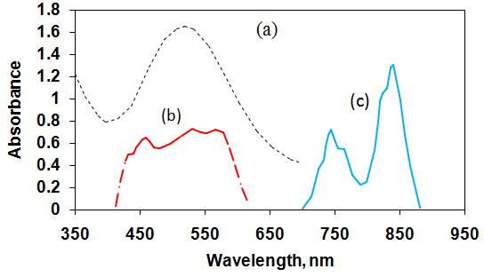 Fig. 2: Absorption spectra of (a) CPX-CLA complex against reagent blank (b) CPX-DDQ complex against a reagent blank and (c) CPX-TCNQ complex against a reagent blank