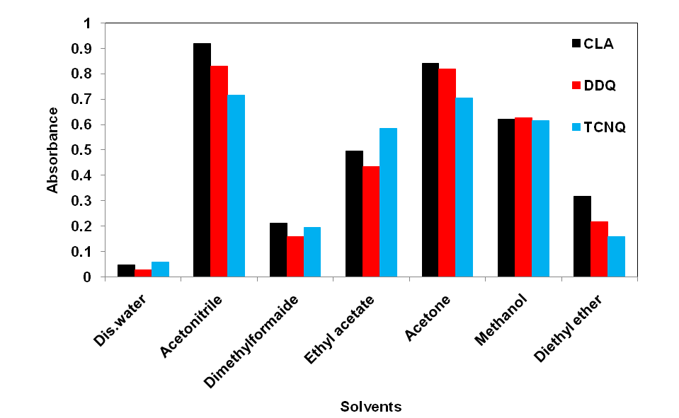 Different solvents, for example, acetonitrile, acetone, methanol, water, ethyl acetate, diethyl ether, and dimethylformamide were used to determine the charge transfer reaction in order to optimize the most appropriate medium for that reaction. Acetonitrile was an ideal solvent for the charge transfer reaction due to its high dielectric constant which raises the maximum yield of radical anions, offering maximum sensitivity [24], high solvation power for CLA, DDQ and TCNQ and gave high absorbance power. Because of their low absorbance or being precipitated on dilution, the other solvents were not appropriate as in fig. 3.