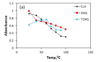 The optimum reaction time was determined by following the absorbance increment at the λmax of the formed complexes. Sample solutions containing CPX and blank were treated identically with the reagents within different time and temperature ranging from 25 to 90 °C. The results obtained indicated that complete color development was attained instantaneously at room temperature (25±2 °C), for CLA and DDQ. Heating at a higher temperature led to a decrease in color intensity, this is attributed to characteristics of CT complexes, positions of CT bands, stabilities and thermodynamic parameters which indicated that complexes can be stabilized for a longer time at low temperatures [25] as described in fig. 4a. TCNQ charge-transfer complex was completely developed after heating in a water bath at 40 °C for 30 min in fig. 4b.