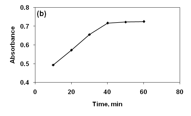 Fig. 4: (a) Effect of temperature on the color intensity of CPX complexes and (b) effect of heating time on color intensity of CPX-TCNQ complex at 40 °C
