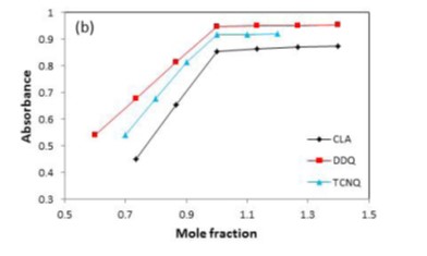 Job’s continuous variation [20] and mole ratio methods [21] were applied in order to determine the suitable ratio between chlorphenoxamine-HC1 (CPX) and CLA, DDQ, and TCNQ. The results showed that, the interaction between the investigated drug and each one of π-acceptors found to be 1:1 as shown in fig. 5a and 5b.