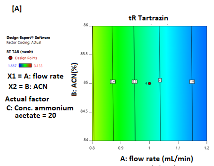 The statistic results revealed that adjusted R2 obtained was>0.8 (acceptable) [18], exhibiting that the experimental model was a good fit using polynomial equation. The difference between predicted R² with the adjusted R² in all responses was less than 0.2. Eq.1 informed that variables of flow rate (mL/min) (X1), have a negative effect on the retention time of TAR, while ratio of ACN (%) (X2) and ammonium acetate concentration (X3) have a positive effect on retention time of TAR.