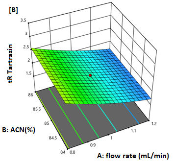 Fig. 2: The contour plot of retention time (in minute) of tartrazine (TAR) [A] and 3D surface graph of retention time of TAR [B] as a results of variables of flow rate (ml/min), concentration of acetonitrile (%), and ammonium acetate concentration