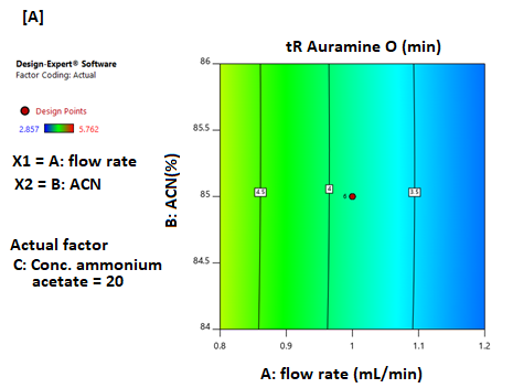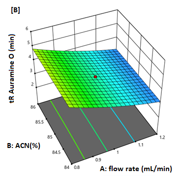 Fig. 3: The contour plot of retention time of Auramine O (AUO) [A] and 3D surface graph of retention time of AUO [B] as a results of variables of flow rate (ml/min), the concentration of acetonitrile (%), and ammonium acetate concentration