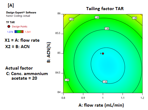 The variables of X1, X2, and X3, quadratic form of X1 contributed significantly for response of Y1 (P<0.05) based on one way ANOVA results. The variables of X1 affected negatively, meaning that the increased levels of flow rate (X1) would decrease the retention time of TAR (decreased sensitivity), while the increased ratio of acetonitrile (X2) and ammonium acetate concentration (X3) could increase the retention time of TAR. Contour plot of retention time TAR along with 3D surface graph was shown in fig. 2.