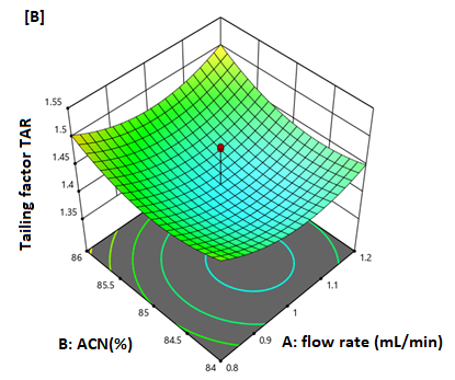 Fig. 4: The contour plot of tailing factor of tartrazine (TAR) [A] and 3D surface graph [B] as a results of variables of flow rate (ml/min), the concentration of acetonitrile (%), and ammonium acetate concentration