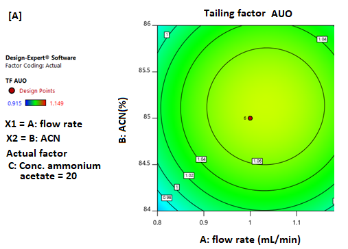 Fig. 5: The contour plot of tailing factor of Auramine O (AUO) [A] and 3D surface graph [B] as a results of variables of flow rate (ml/min), the concentration of acetonitrile (%), and ammonium acetate concentration
