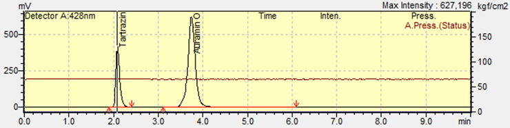 The synthetic colorants including TAR and AUO are suspected to be unhealthy and unsafe substances for humans, and as a consequence, synthetic colorants became perceptible as undesirable or harmful by consumers [3, 4]. Therefore, the synthetic colours have been the subject of numerous toxicological investigations and their values are established by national and international legislation, especially for their use in food, drinks, drugs and cosmetics [5, 6]. TAR is dangerous if used over safety limits and AUO can cause toxicity and even death for consumers. Therefore, analytical methods capable of detecting and quantifying TAR and AUO must be developed in order to ensure the food safety. Among analytical methods, reversed phase HPLC with a variety of detectors was available for analysis of TAR and AUO.