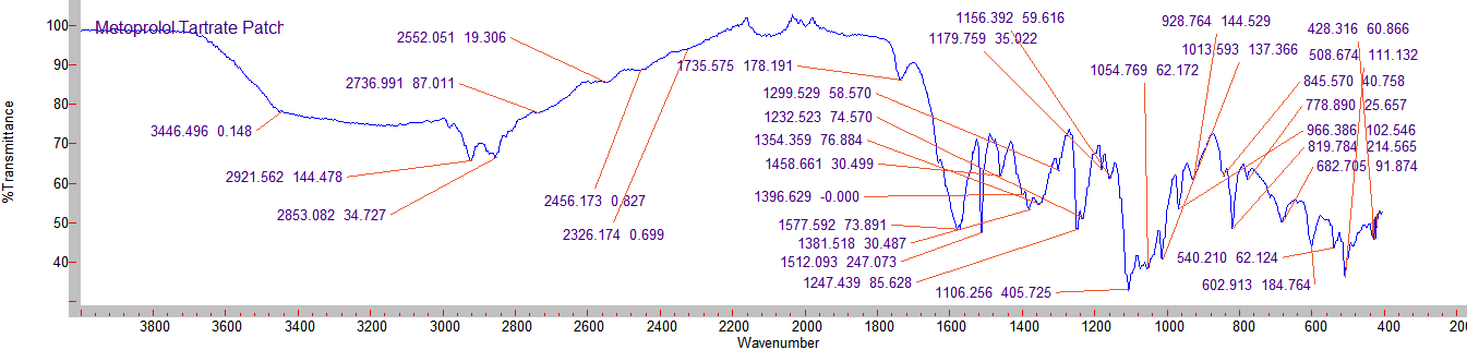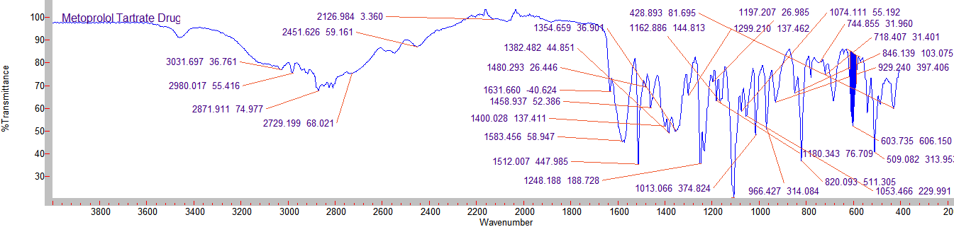 The drug was characterized by FTIR spectroscopy. The spectrum was recorded using FTIR Spectrophotometer (Agilent). The scanning range was 4000 to 600 cm-1. The spectrum of Metoprolol tartrate is shown in fig. 2.