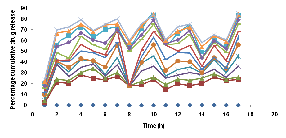 The in vitro skin permeation studies were carried out using keshary chien cell for a period of 24 h. The patches were 15 cm2 in area and were prepared by solvent casting method by using PEG 400 as a plasticizer. In order to know whether the patches would release drug in desired fashion in vitro permeation studies in Keshary chien cell was carried out. Along with that, diffusion studies were also evaluated in phosphate buffer pH7.4 [23-25] The in vitro permeation of various formulations were the in vitro release of formulations from F1 to F16 were found in the range of 58.03% to 80.20%, as depicted in table 3. From the evaluation of patches formulation, F10 containing basil oil as penetration enhancer in the concentration of 1.5% v/v was found to be best among all batches because of its consistent release rate for 24 h and extent of drug release was 85.20% as depicted in fig. 4 and table 3. The formulation F10 have achieved highest drug release as compared to other polymers.