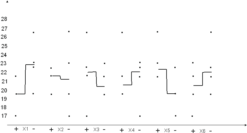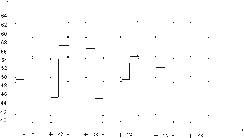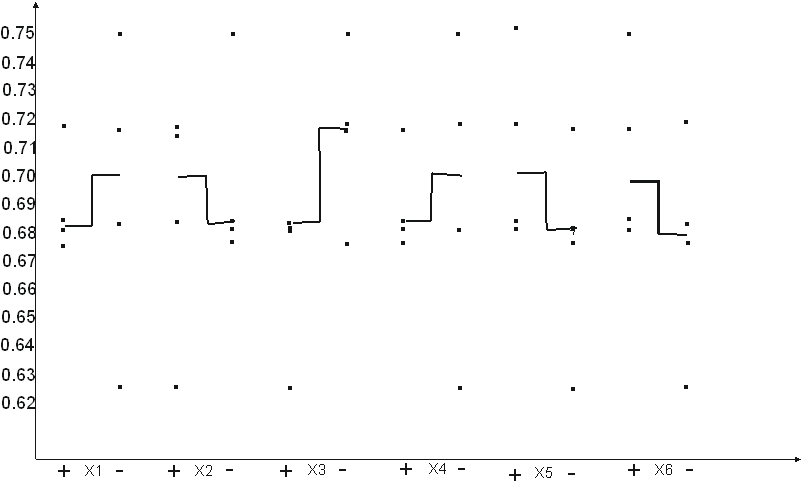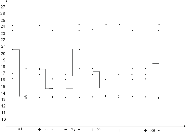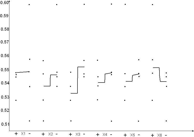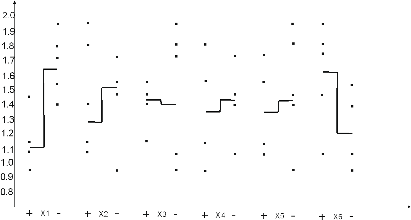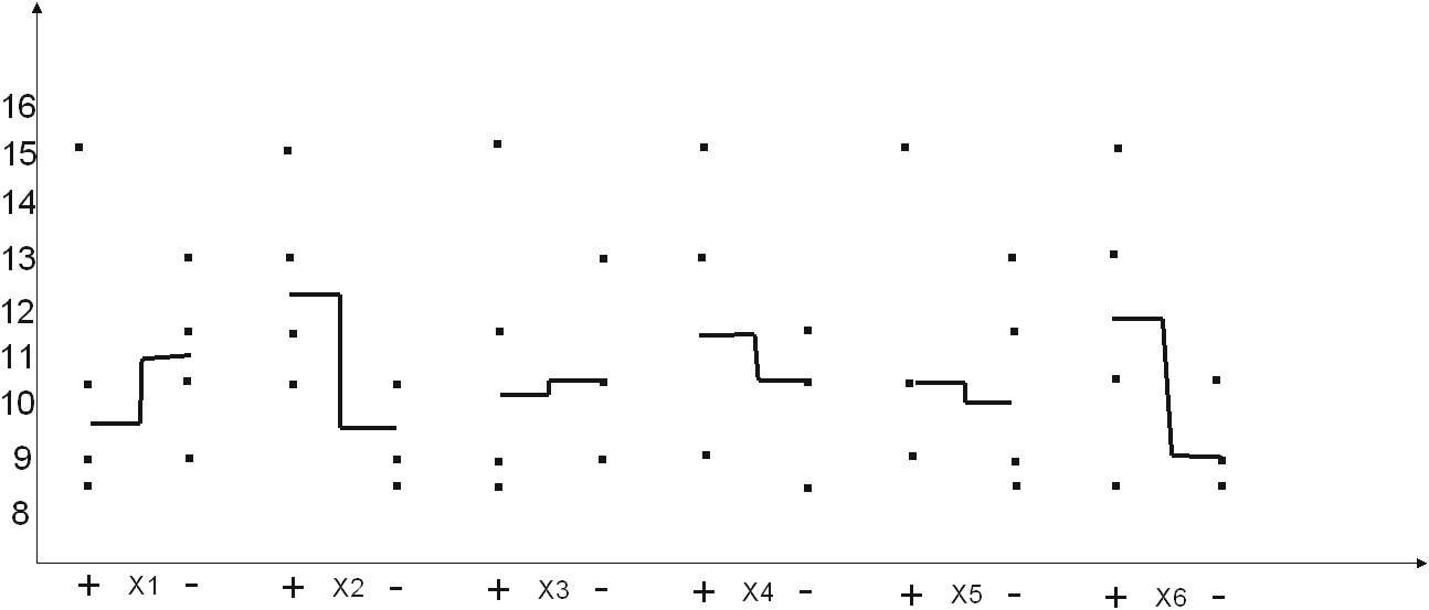 Scatter diagrams were constructed based on the results from table 2 and table 3. Determination of significant factors was carried out using scatter diagram. The difference between the average values of the factor for the upper and lower levels determines the influence of the factor on the technological parameter. The difference between the average values of the parameter is shown through the median on scatter diagram. The value of the median indicates the significance of the factor. Then, the significance check of the obtained effects is done by the Students t-criterion.