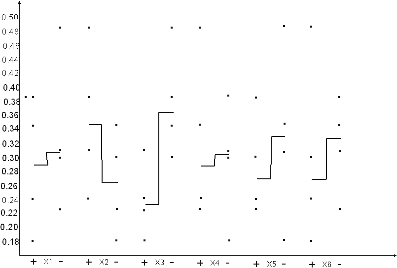 Primarily, the matrix of design of experiments was defined, the experiment took place and based on its results scatter diagrams were constructed. Significant factors are taken from scatter diagrams, and their selection is proved by calculations. The design construction of experiments matrix is preceded by coding the factors, selection of variation levels and by determining the experiment center [11].
