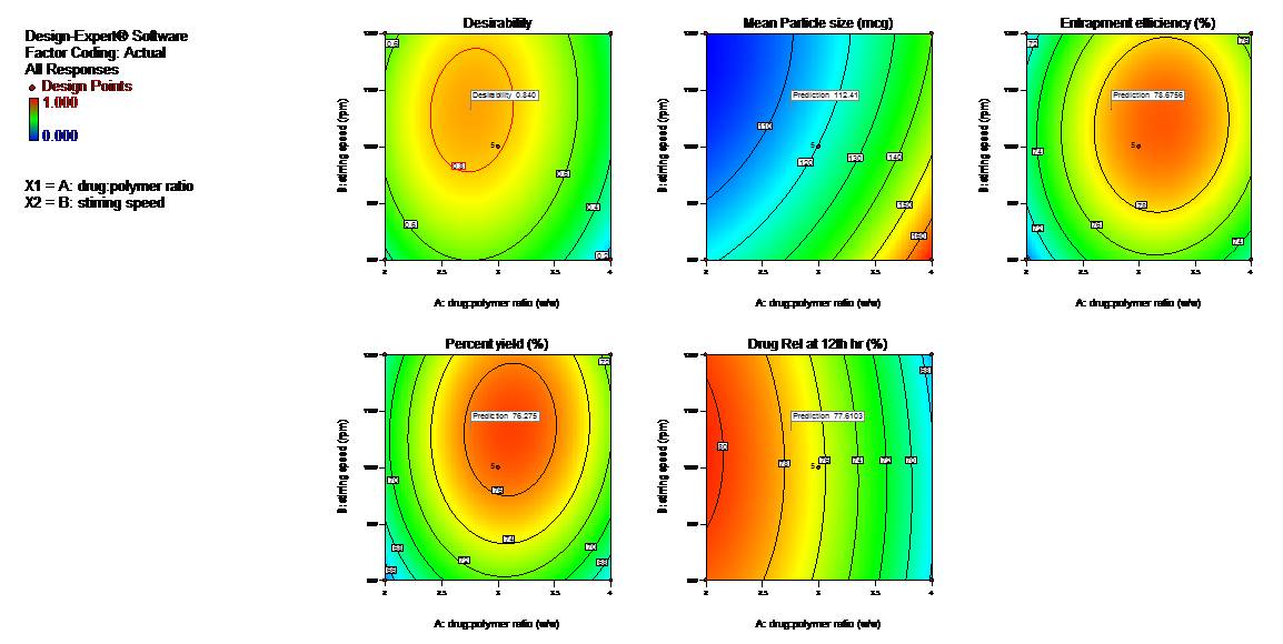 In case of percent yield (Y3), it was observed that as the drug: polymer ratio was increased, the total material in the dispersed phase increased. Finer particles formed during the preparation of microparticles tend to coalesce to give bigger particles with better percent yield. The model applied for drug release at 12th hour (Y4) showed that as the drug: polymer ratio was varied towards higher side, the drug release retarded from the formulations as diffusional path length for drug release increased while with increase in stirring speed the interfacial area per unit volume increased, so, the drug release also increased [8, 26-28].