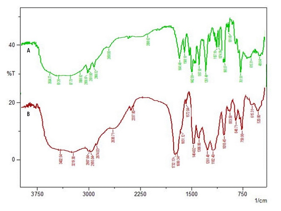Fig. 2: FTIR spectra of (A) Losartan potassium and (B) optimized formulation