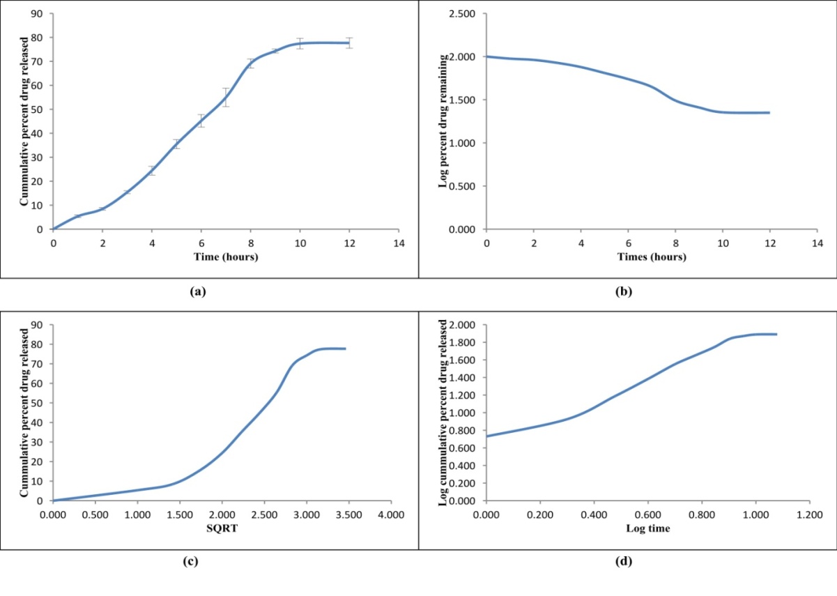 Fig. 6: Dissolution models for optimized formulation (a) Zero order, (b) First order, (c) Higuchi model and (d) Koresmeyer peppas model