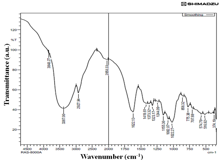 Fig. 3 shows the characteristic absorption band at 3387 cm-1 showing the presence of hydrogen-bonded O-H group. The characteristic peak at 3400 cm-1-3500 cm-1 for an amino group would have been masked by the broad O-H band. The presence of alkane C-H stretching, aldehydic C-H stretching and sugar, galactose, arabinose, rhamnose is confirmed by the appearance of an absorption peak at 2927 cm-1. The peak at 1622.13 cm-1 is the characteristic band for C=C stretch, N-H amide bend, NO2 of both aliphatic and aromatic galacto proteins and amino acids of the polymer. The vibrational band at1323.17 cm-1 and 1419.61 cm-1 are due to C=O sym stretch and O-H bending of glucoronic acid. Band at 1373.32 cm-1 are characteristics of CH3 bend in alkane, aromatic C=C stretch, ketone C-C stretch; amine C-N stretch of polysaccharides and galacto proteins. Alkane bending and alcohol stretching due to sugar backbone is confirmed by the appearance of peak at 1244.09 cm-1. The alkene C-H bends of polysaccharides are found as 1022.27 cm-1 [29].