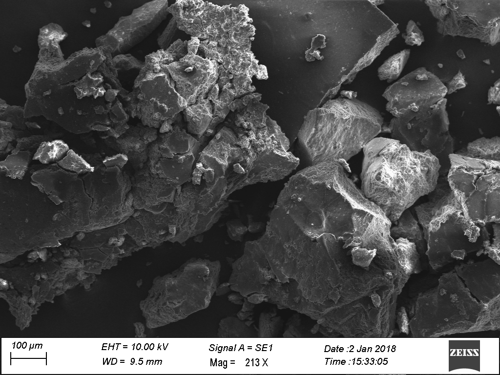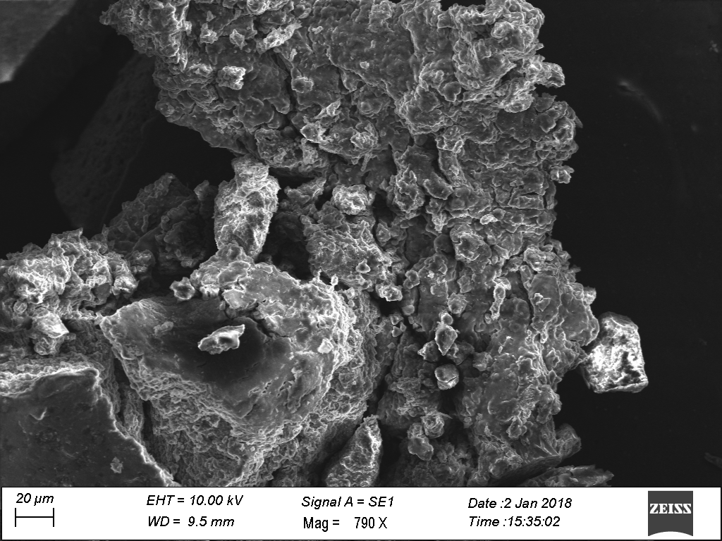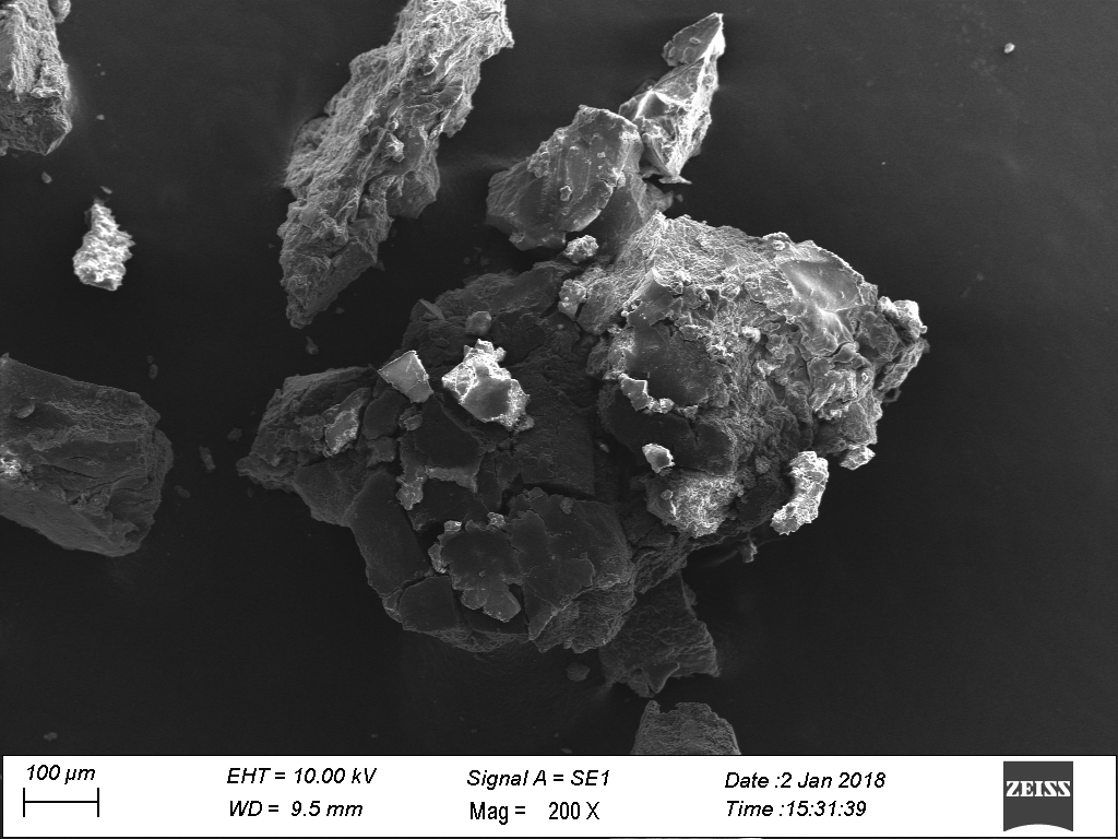 The Scanning Electron Microscope (SEM) image of the gum obtained is represented in fig. 4. The microphotographs of the gum shows that the particles are found as aggregates of irregular dimensions, shape devoid of crystallinity, they are fibrous in nature [21]. The Manilkara hexandra gum (MHG) non-uniform shape, and it retards from the dosage form due to pore size [30, 31].