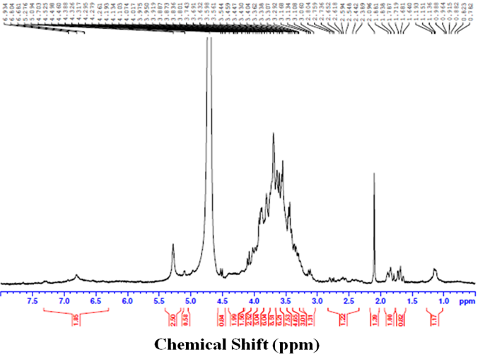 The Proton and Carbon Nuclear Magnetic Resonance (NMR) spectrum correlate with the specifications for gum [29]. Using Nuclear Magnetic Resonance (NMR) the structure and property of material (polymer) can be studied. It helps to identify the material, the different functional group, detect minor compounds and impurity [34]. The signals between 3 and 6 ppm correspond to polysaccharides. Chemical shift at 1.2 ppm is due to the methyl group of rhamnose. An intense peak at 2.1 ppm shows the presence of an acetyl group. Signals between 3.1 to 4 ppm are due to the methoxy group. The presence of non-anomeric protons are seen by the arisement of peaks between 3.63 ppm-4.70 ppm in 1H Nuclear Magnetic Resonance (NMR) and between 60-85 ppm in 13C spectra. An intense peak at 4.80 ppm is due to water molecules shown in fig. 6a and fig. 6b. Typical 1H and 13C Nuclear Magnetic Resonance (NMR) spectra of the gums are seen by the appearance of peaks in the anomeric region between 4.7-5.9 ppm and 90-110 ppm respectively [35].