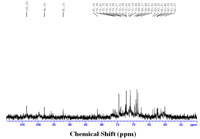 The Nuclear Magnetic Resonance (NMR) spectra of the gum were recorded in NMR (BRUKER 300 MHz) Ultra shield Magnet with AVANCE II type console to identify its structural features. The H1 and C13 NMR were measured from 0-8 ppm and 50-110 ppm respectively.