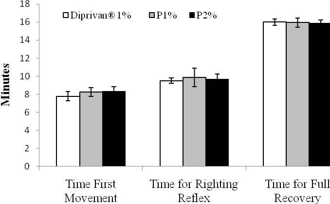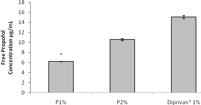 In the present study, the comparison in intensity of pain from P1% and P2% with Diprivan®1% was evaluated by determination of free propofol concentration in the aqueous phase by HPLC method. The rat paw lick test was performed to compare the intensity of pain in animals after injection. The sleep recovery test was conducted to compare the pharmacological effect of the formulations to Diprivan®.