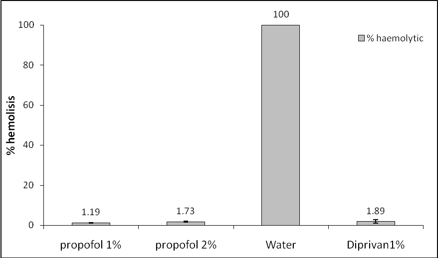 The purpose of this test was to ensure that this formula would give damage or not to the blood [35]. The result showed that distilled water caused 100% hemolysis in blood. Whereas P1%, P2% and Diprivan® 1% were cause a little bit hemolysis in blood, but it was still fulfilled the safety requirement (fig. 4). Parenteral administration of the drug still safety to use if the % haemolysis of the formulation below than 20% [36]. The reason of this phenomena happen is due to the composition of the emulsion like a phospholipid in emulsion would cause interaction with red blood cell [37].
