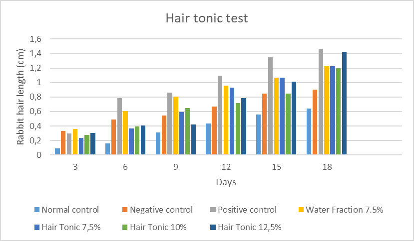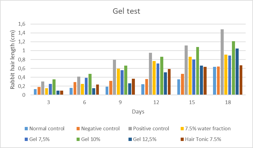 Data obtained from the measurement results were made of tables and diagrams. For the measurement of the effect of the hair tonic formula, for example, data was obtained (table 5) and illustrated in fig. 1 and then calculated statistically. Table 5 was data from the results of rabbit hair length measurements for formula hair tonics whereas fig. 1 and fig. 2 respectively showed hair growth stimulant activity test of Gel and Hair tonic formula.