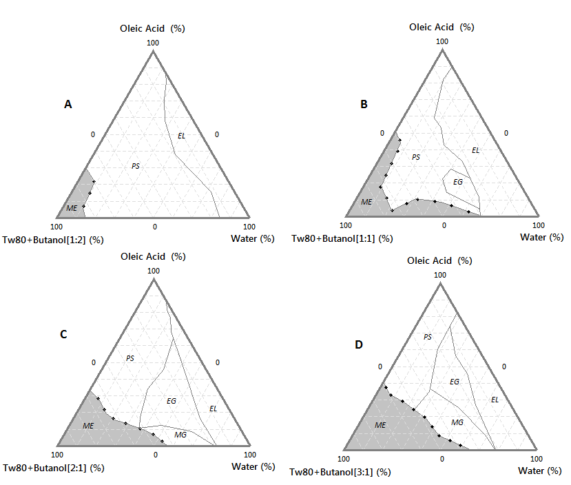 As described in previous studies [22, 23], phase diagrams were constructed by titration method to obtain appropriate components and their concentration ranges allowing a large microemulsion surface.