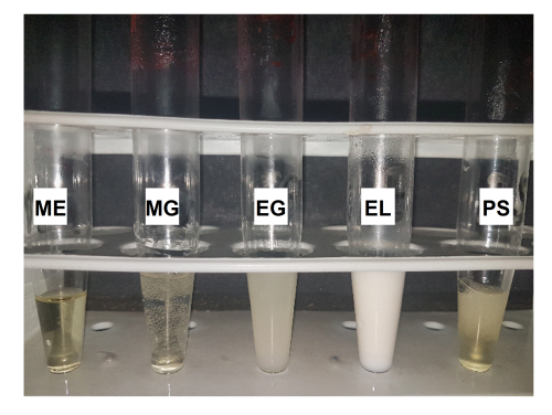 After equilibration for 24 h, the mixtures were assessed macroscopically and determined as being microemulsions, liquid coarse emulsions, gels, and phase separation. Gels (transparent i.e. microgels (MG) or opaque i.e. emulgels (EG)) were claimed for those highly viscous mixtures that did not show a change in the meniscus after tilted to an angle of 90◦.
