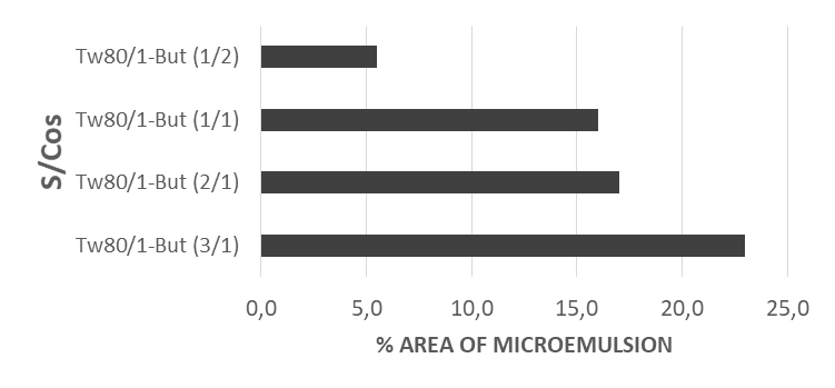 However, when the surfactant concentration was below 55% in the different phase diagrams, some instability and phase separation were observed, indicating that at lower surfactant concentrations there could not be a balance between high proportions of aqueous and oily phases. The existence areas of microemulsion made with different S/Cos ratios are presented in fig. 3.