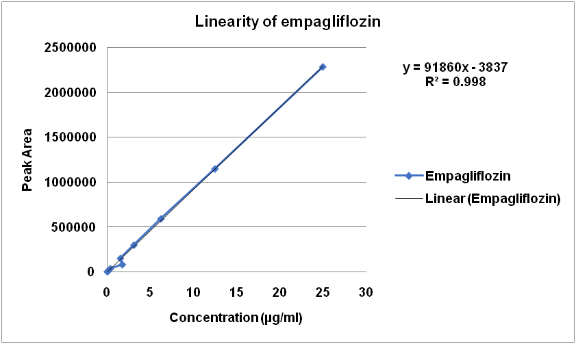 Six different concentrations against corresponding peaks were plotted for developing the calibration curve. The graph showed excellent correlation between the concentrations and peak area when observed within the range of (0.0495-25µg/ml) for empagliflozin. The co-relation co-efficient for empagliflozin was ≥ 0.998, the slope and the intercept were depicted at 91860 and 3837 respectively. The graph depicting linearity of the method is represented in fig. 5.